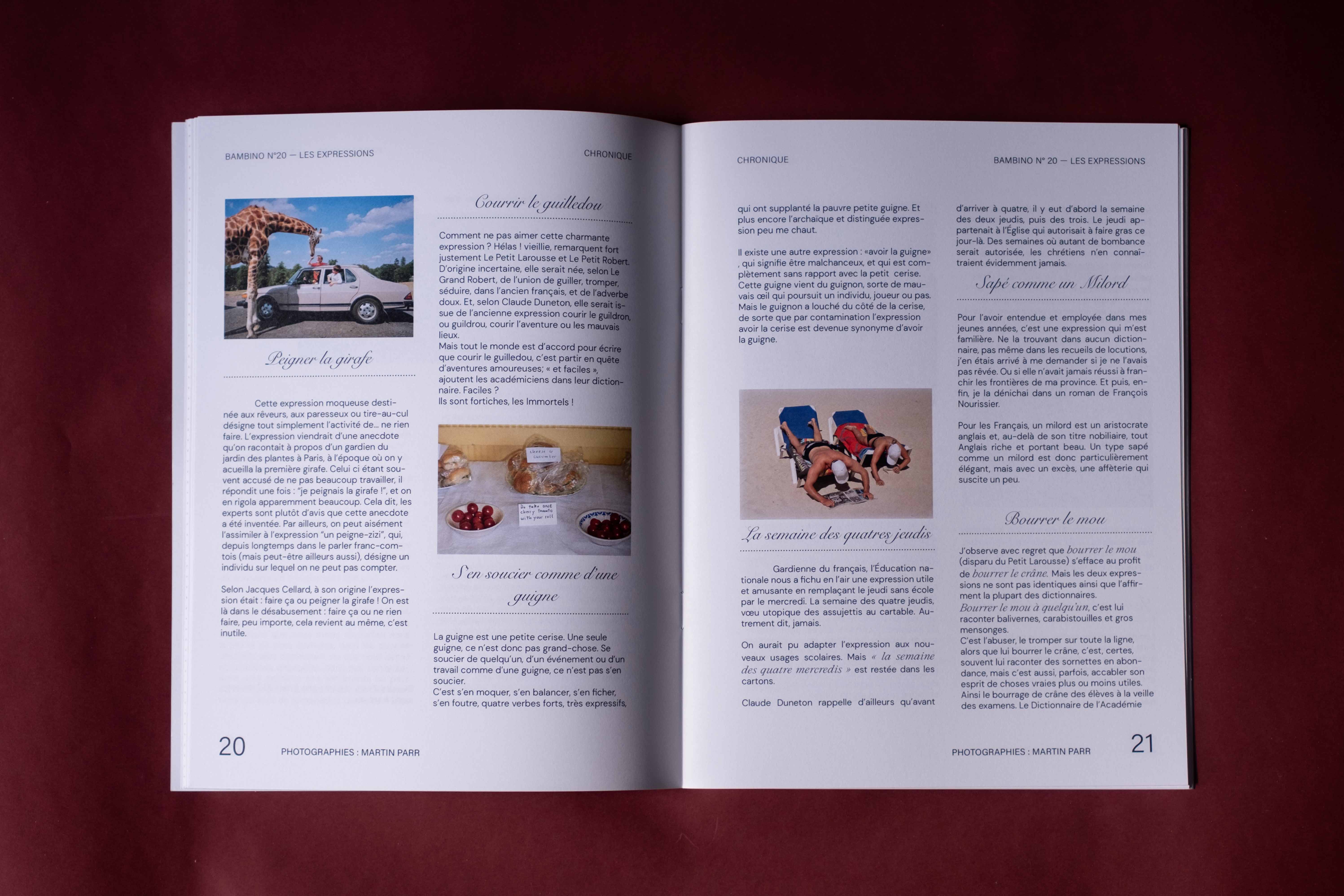 A continuation of my dissertation on linguistic expressions, Bambino is a double magazine that you will systematically receive in two copies: a magazine for adults, and another for children. Each issue focuses on a theme - in this case, expressions of the language - and treats the same subject, adapted to both target audiences, with the intrinsic aim of transmission between generations.