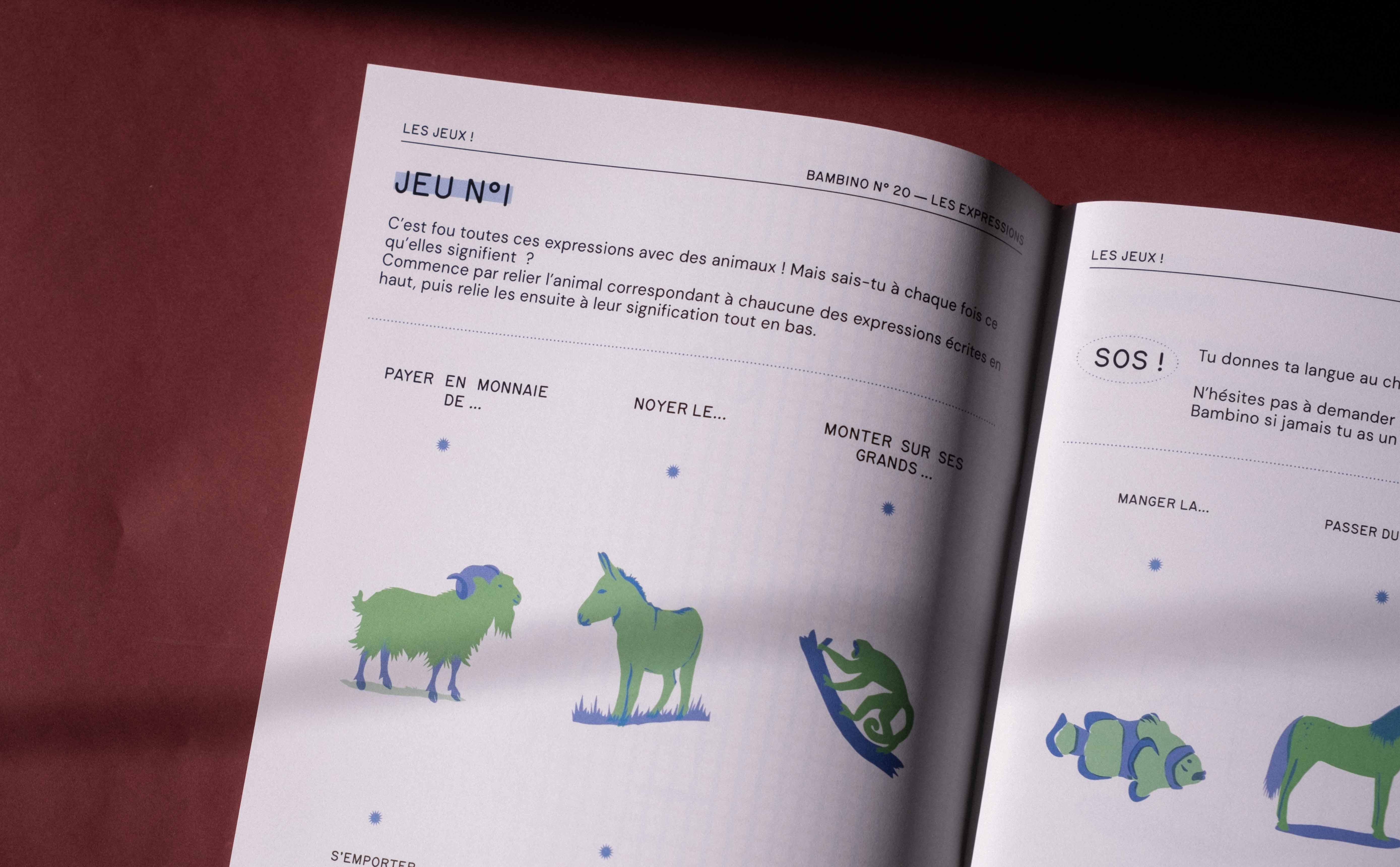 A continuation of my dissertation on linguistic expressions, Bambino is a double magazine that you will systematically receive in two copies: a magazine for adults, and another for children. Each issue focuses on a theme - in this case, expressions of the language - and treats the same subject, adapted to both target audiences, with the intrinsic aim of transmission between generations.